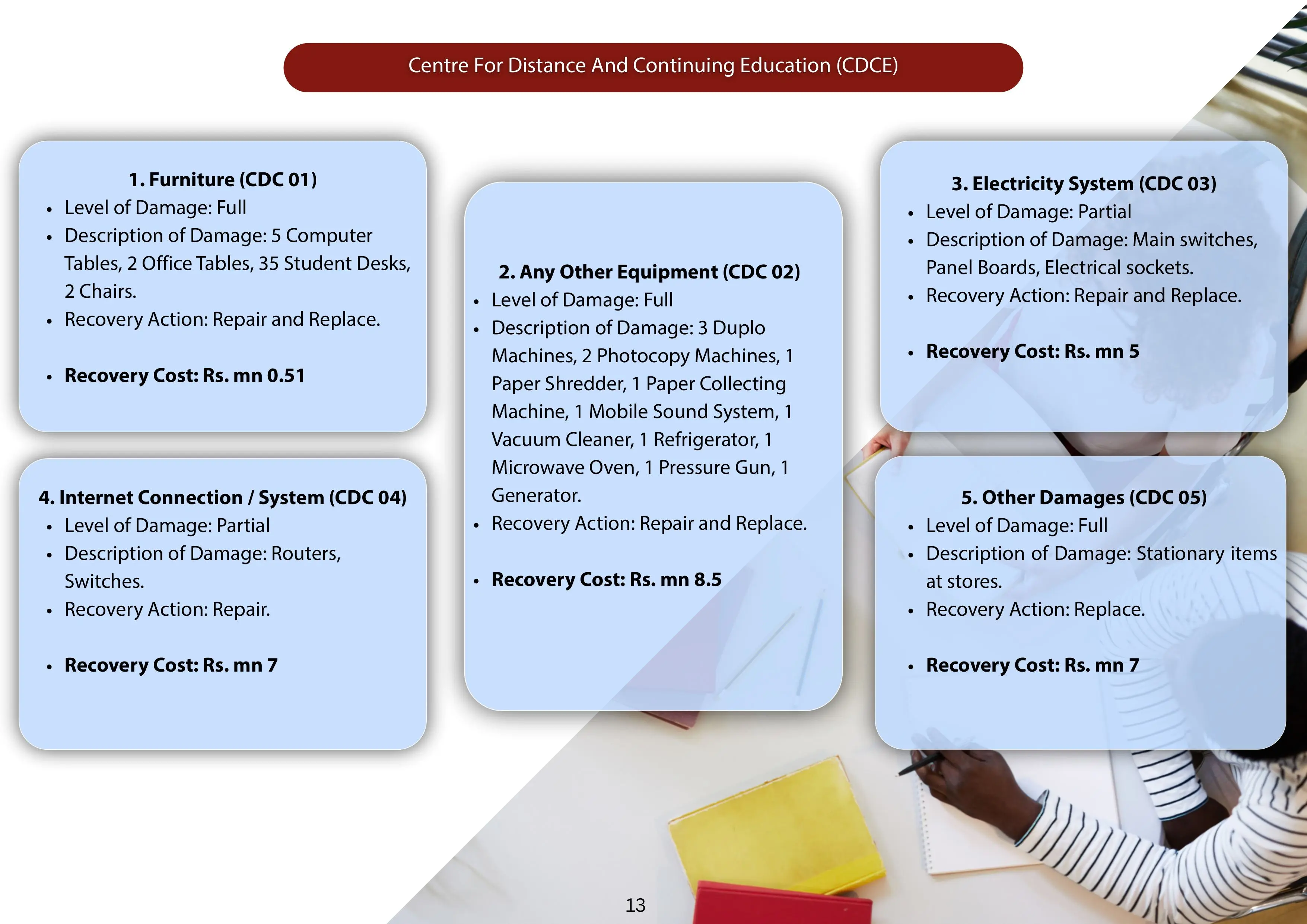 The Ditwah cyclone floods present both a profound challenge and an opportunity to rebuild the University of Peradeniya as a safer, more resilient, and disaster-ready educational institution. Support from funding bodies/donors will enable the university to restore critical infrastructure, safeguard its academic mission, and demonstrate the transformative role of science and education in times of crisis. The University of Peradeniya respectfully seeks your partnership and financial support to realize this restoration and resilience-building initiative for the benefit of present and future generations.